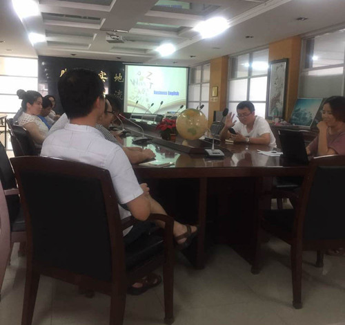 本次活動由國貿(mào)部許經(jīng)理主持,主題是基礎商務英語的應用,圍繞著Welcoming(歡迎詞)、Introduction(自我介紹)、Greetings(招呼問候)、Offering(提議)、Hotel( 酒店)、Small talk topics(閑聊話題)這幾個話題來開展。首先由國貿(mào)部許經(jīng)理用一口流利的英語歡迎大家,進入第一環(huán)節(jié),先是由各位開發(fā)人員充分運用自己的英語能力,介紹了自己的英語名字,個人的喜好,此環(huán)節(jié)用英語調動開發(fā)人員表達能力的積極性,用已有的英語水平表達自己的觀點、意愿,使整個英語沙龍活動沉浸在和諧的氣氛里。第二環(huán)節(jié),由國貿(mào)部業(yè)務員扮演了展會上國外客戶參觀我司展臺,我司業(yè)務員接待客戶,講解產(chǎn)品功能的一個演示,表演過程中表情豐富,語言風趣,為全場營造了一種活躍熱鬧的氛圍。進入后面的Offering(提議)、Hotel( 酒店)、Small talk topics(閑聊話題)幾個環(huán)節(jié),大家選擇一個主題,用英語交流演示,此環(huán)節(jié)以一種無比輕松的不同于培訓形式的方式給每位開發(fā)人員提供了操練口語的時機,激發(fā)了開發(fā)人員學習英語的熱心。